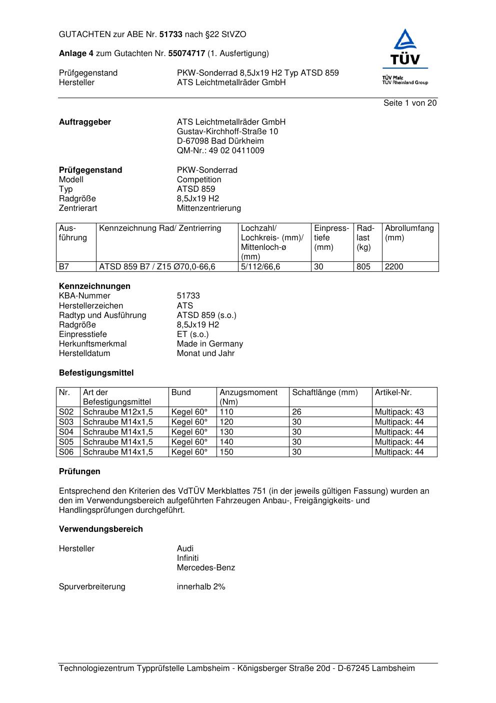 Dieses Gutachten (abe) bezieht sich auf die Alufelge ATS ATSD 85 9 in der Ausführung 8.5Jx19 ET 0, Mittenloch 0 mm (KBA 51733). Im PDF findest du typischerweise zulässige Reifengrößen, Auflagen/Anbauhinweise und – je nach Dokument – Hinweise zur Eintragung.