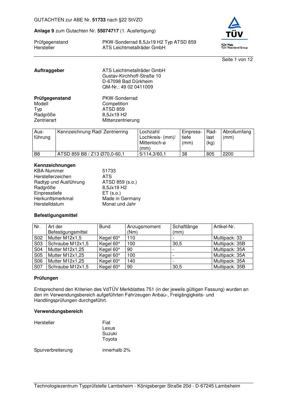 Dieses Gutachten (abe) bezieht sich auf die Alufelge ATS ATSD 85 9 in der Ausführung 8.5Jx19 ET 0, Mittenloch 0 mm (KBA 51733). Im PDF findest du typischerweise zulässige Reifengrößen, Auflagen/Anbauhinweise und – je nach Dokument – Hinweise zur Eintragung.