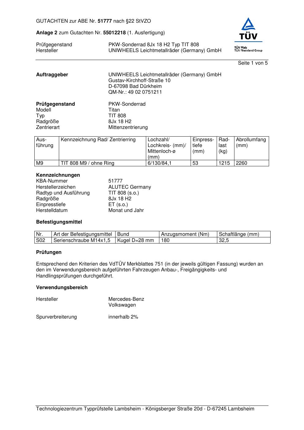 Dieses Gutachten (abe) bezieht sich auf die Alufelge ALUTEC TIT 808 in der Ausführung 8Jx18 ET 0, Mittenloch 0 mm (KBA 51777). Im PDF findest du typischerweise zulässige Reifengrößen, Auflagen/Anbauhinweise und – je nach Dokument – Hinweise zur Eintragung.