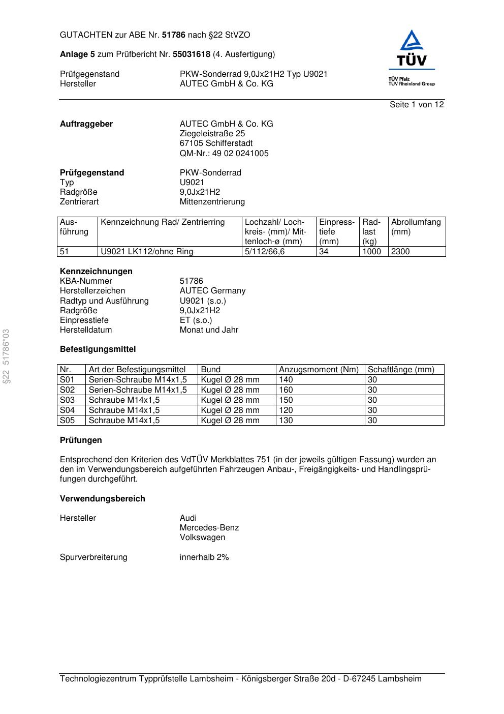 Dieses Gutachten (abe) bezieht sich auf die Alufelge Autec U9021 in der Ausführung 9Jx21 ET 0, Mittenloch 0 mm (KBA 51786). Im PDF findest du typischerweise zulässige Reifengrößen, Auflagen/Anbauhinweise und – je nach Dokument – Hinweise zur Eintragung.