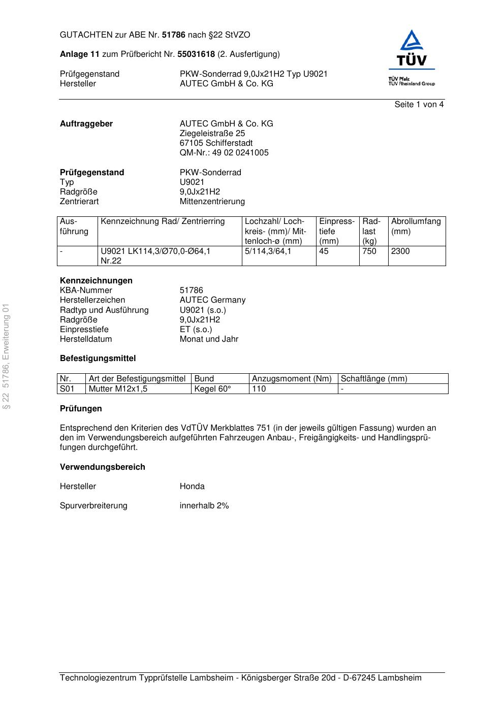 Dieses Gutachten (abe) bezieht sich auf die Alufelge Autec U9021 in der Ausführung 9Jx21 ET 0, Mittenloch 0 mm (KBA 51786). Im PDF findest du typischerweise zulässige Reifengrößen, Auflagen/Anbauhinweise und – je nach Dokument – Hinweise zur Eintragung.