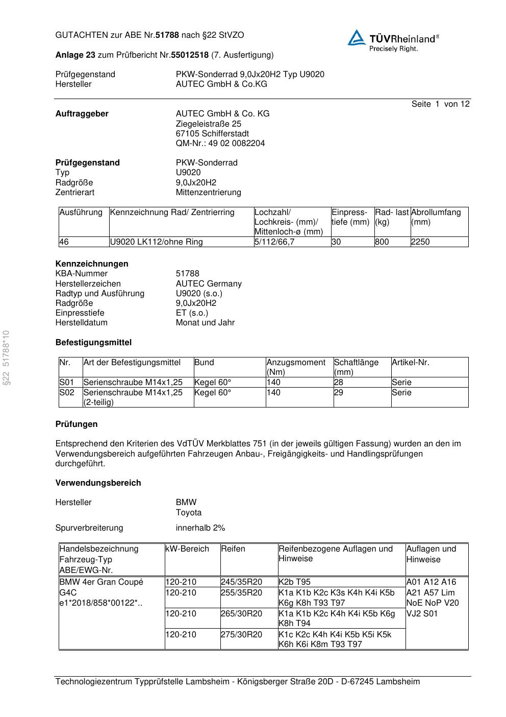 Dieses Gutachten (abe) bezieht sich auf die Alufelge Autec U9020 in der Ausführung 9Jx2 ET 0, Mittenloch 0 mm (KBA 51788). Im PDF findest du typischerweise zulässige Reifengrößen, Auflagen/Anbauhinweise und – je nach Dokument – Hinweise zur Eintragung.