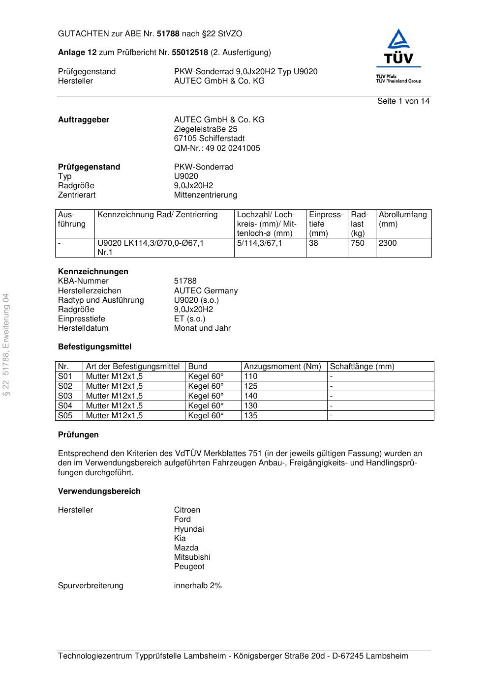 Dieses Gutachten (abe) bezieht sich auf die Alufelge Autec U9020 in der Ausführung 9Jx2 ET 0, Mittenloch 0 mm (KBA 51788). Im PDF findest du typischerweise zulässige Reifengrößen, Auflagen/Anbauhinweise und – je nach Dokument – Hinweise zur Eintragung.
