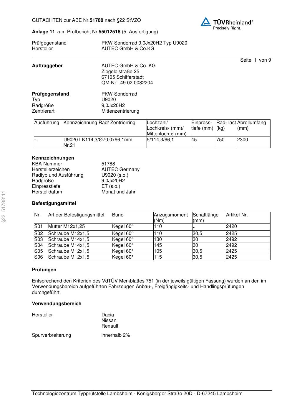 Dieses Gutachten (abe) bezieht sich auf die Alufelge Autec U9020 in der Ausführung 9Jx2 ET 0, Mittenloch 0 mm (KBA 51788). Im PDF findest du typischerweise zulässige Reifengrößen, Auflagen/Anbauhinweise und – je nach Dokument – Hinweise zur Eintragung.
