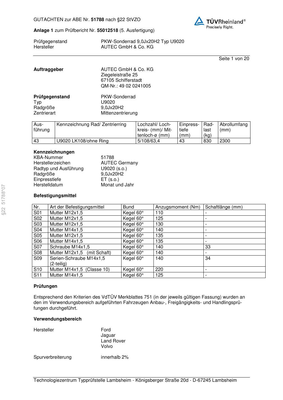 Felgengutachten / abe für Alufelgen Autec U9020 (9Jx2 ET 0, Mittenloch 0 mm) mit KBA 51788 (Zertifikatsnummer 51788). Hier kostenlos als PDF herunterladen. Der Download-Link ist 24 Stunden gültig und kann bis zu zwei Mal verwendet werden.