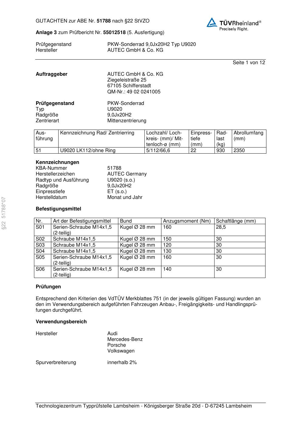 Felgengutachten / abe für Alufelgen Autec U9020 (9Jx2 ET 0, Mittenloch 0 mm) mit KBA 51788 (Zertifikatsnummer 51788). Hier kostenlos als PDF herunterladen. Der Download-Link ist 24 Stunden gültig und kann bis zu zwei Mal verwendet werden.
