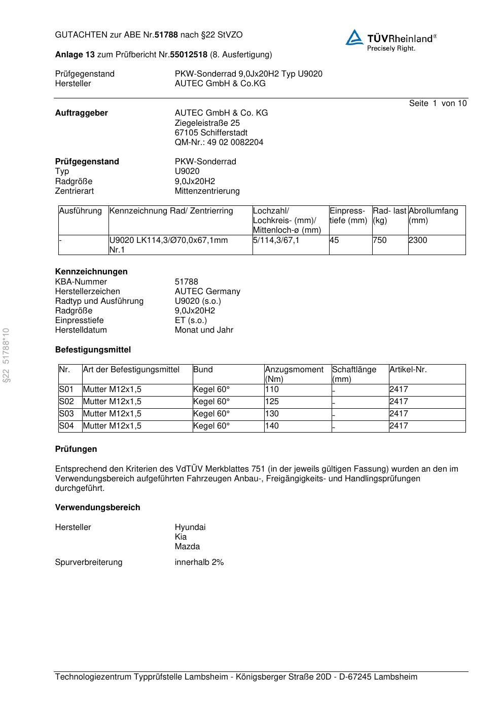 Felgengutachten / abe für Alufelgen Autec U9020 (9Jx2 ET 0, Mittenloch 0 mm) mit KBA 51788 (Zertifikatsnummer 51788). Hier kostenlos als PDF herunterladen. Der Download-Link ist 24 Stunden gültig und kann bis zu zwei Mal verwendet werden.