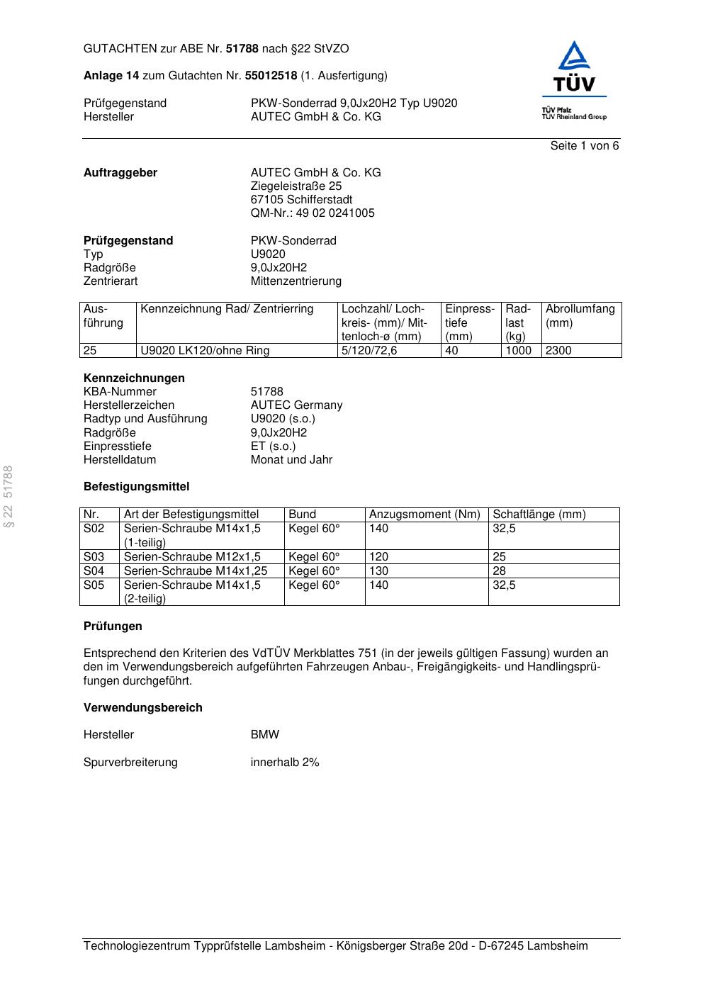Dieses Gutachten (abe) bezieht sich auf die Alufelge Autec U9020 in der Ausführung 9Jx2 ET 0, Mittenloch 0 mm (KBA 51788). Im PDF findest du typischerweise zulässige Reifengrößen, Auflagen/Anbauhinweise und – je nach Dokument – Hinweise zur Eintragung.
