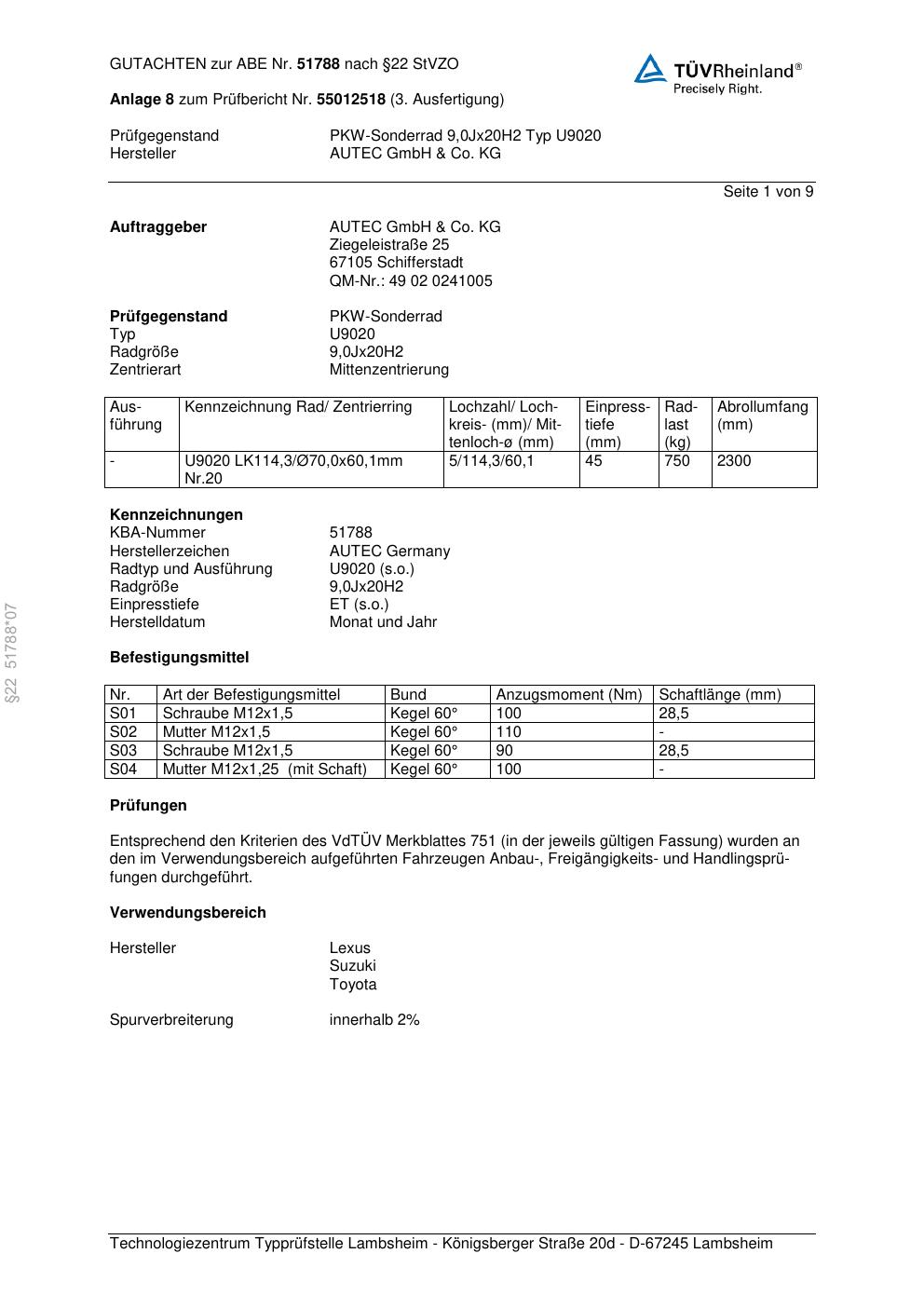 Dieses Gutachten (abe) bezieht sich auf die Alufelge Autec U9020 in der Ausführung 9Jx2 ET 0, Mittenloch 0 mm (KBA 51788). Im PDF findest du typischerweise zulässige Reifengrößen, Auflagen/Anbauhinweise und – je nach Dokument – Hinweise zur Eintragung.