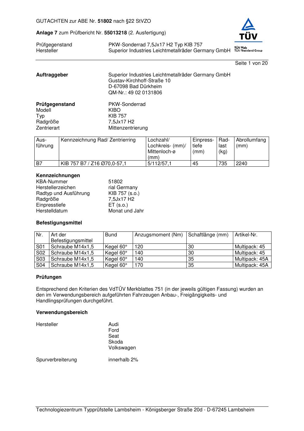 Dieses Gutachten (abe) bezieht sich auf die Alufelge brand-rial KIB 757 in der Ausführung 7.5Jx17 ET 0, Mittenloch 0 mm (KBA 51802). Im PDF findest du typischerweise zulässige Reifengrößen, Auflagen/Anbauhinweise und – je nach Dokument – Hinweise zur Eintragung.