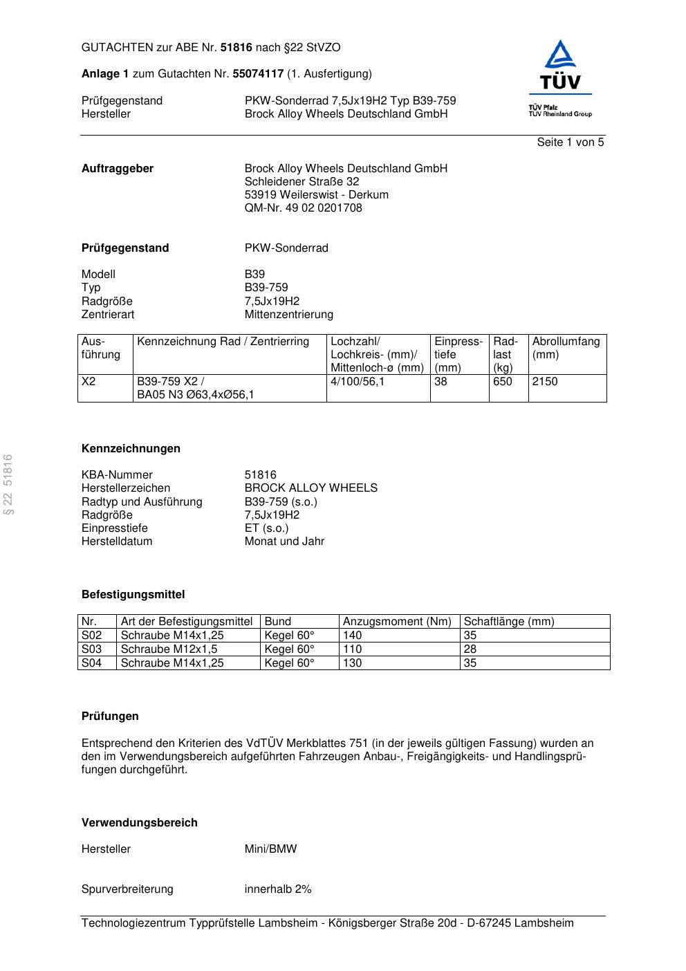 Dieses Gutachten (abe) bezieht sich auf die Alufelge Brock B39-759 in der Ausführung 7.5Jx19 ET 0, Mittenloch 0 mm (KBA 51816). Im PDF findest du typischerweise zulässige Reifengrößen, Auflagen/Anbauhinweise und – je nach Dokument – Hinweise zur Eintragung.