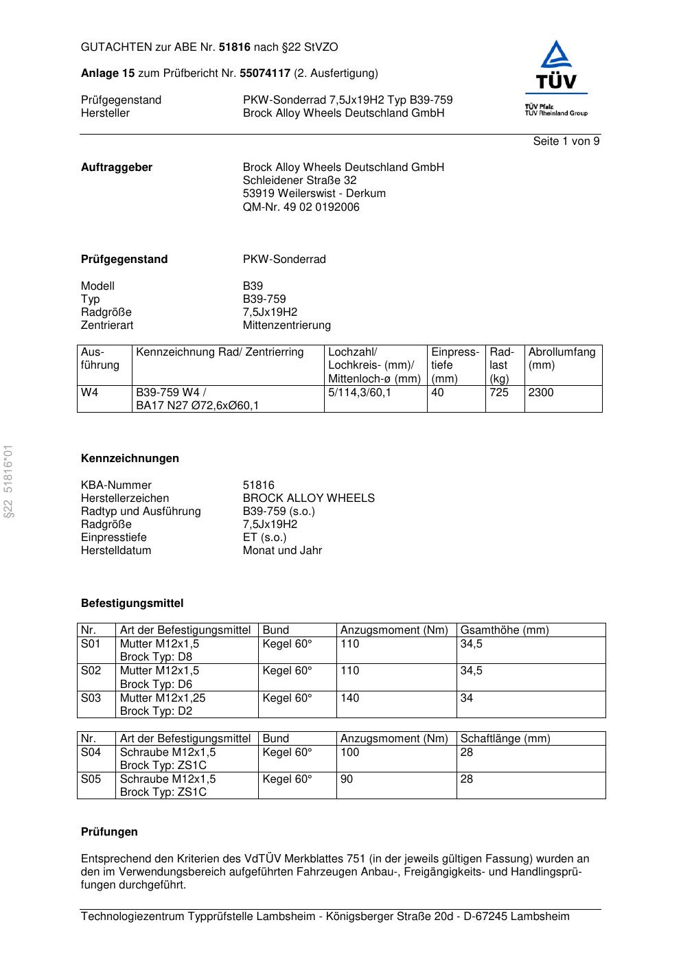 Dieses Gutachten (abe) bezieht sich auf die Alufelge Brock B39-759 in der Ausführung 7.5Jx19 ET 0, Mittenloch 0 mm (KBA 51816). Im PDF findest du typischerweise zulässige Reifengrößen, Auflagen/Anbauhinweise und – je nach Dokument – Hinweise zur Eintragung.