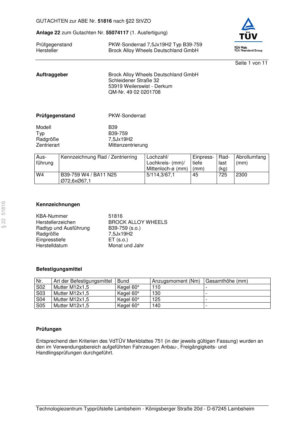 Dieses Gutachten (abe) bezieht sich auf die Alufelge Brock B39-759 in der Ausführung 7.5Jx19 ET 0, Mittenloch 0 mm (KBA 51816). Im PDF findest du typischerweise zulässige Reifengrößen, Auflagen/Anbauhinweise und – je nach Dokument – Hinweise zur Eintragung.