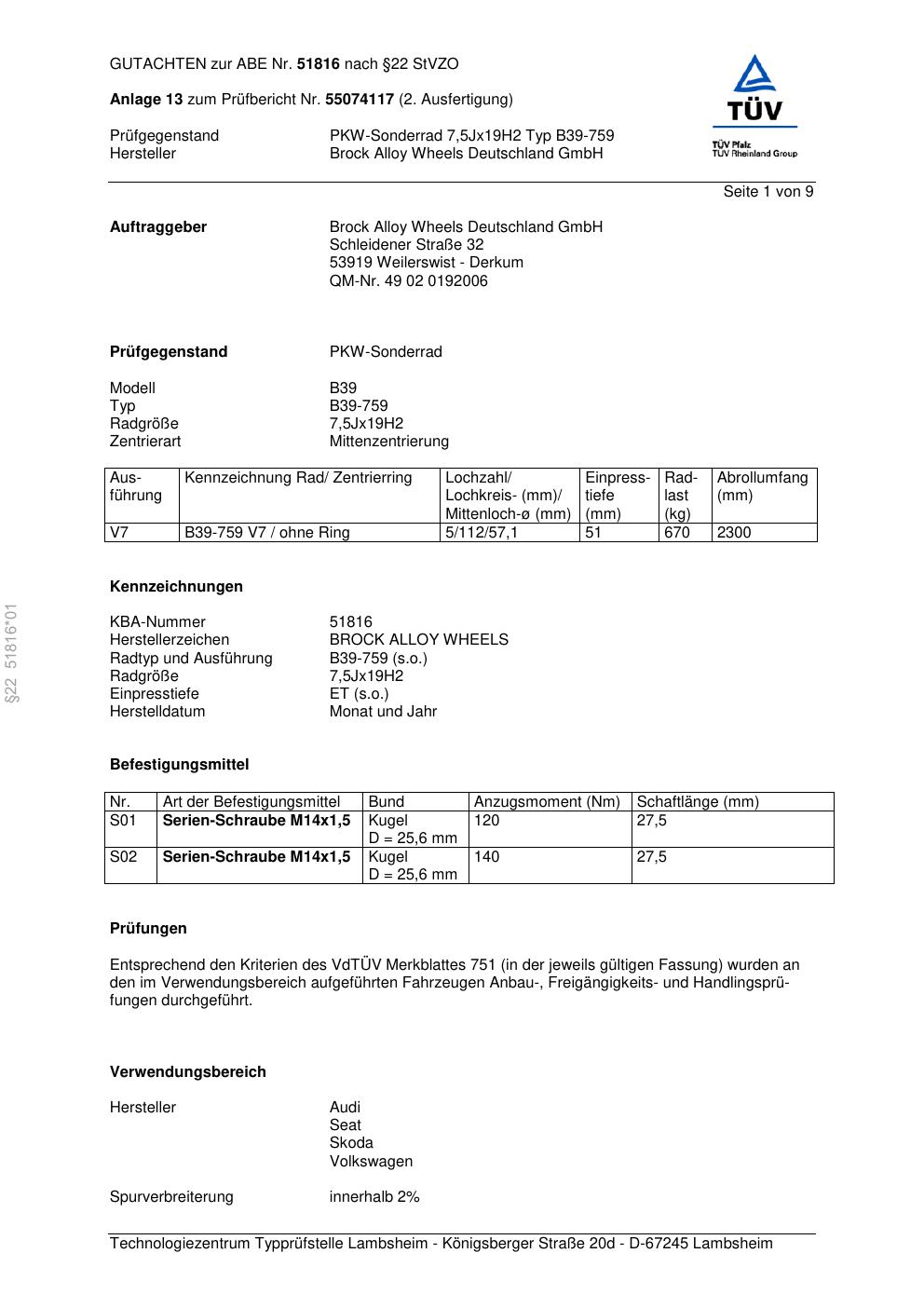 Dieses Gutachten (abe) bezieht sich auf die Alufelge Brock B39-759 in der Ausführung 7.5Jx19 ET 0, Mittenloch 0 mm (KBA 51816). Im PDF findest du typischerweise zulässige Reifengrößen, Auflagen/Anbauhinweise und – je nach Dokument – Hinweise zur Eintragung.