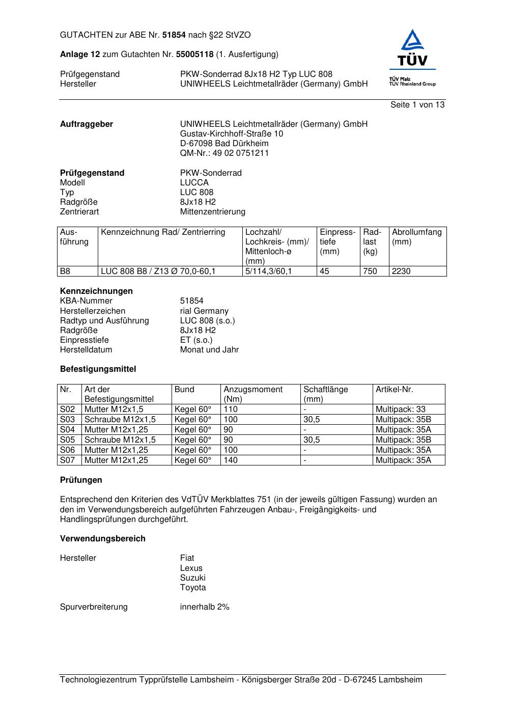 Dieses Gutachten (abe) bezieht sich auf die Alufelge brand-rial LUC 808 in der Ausführung 8Jx18 ET 0, Mittenloch 0 mm (KBA 51854). Im PDF findest du typischerweise zulässige Reifengrößen, Auflagen/Anbauhinweise und – je nach Dokument – Hinweise zur Eintragung.