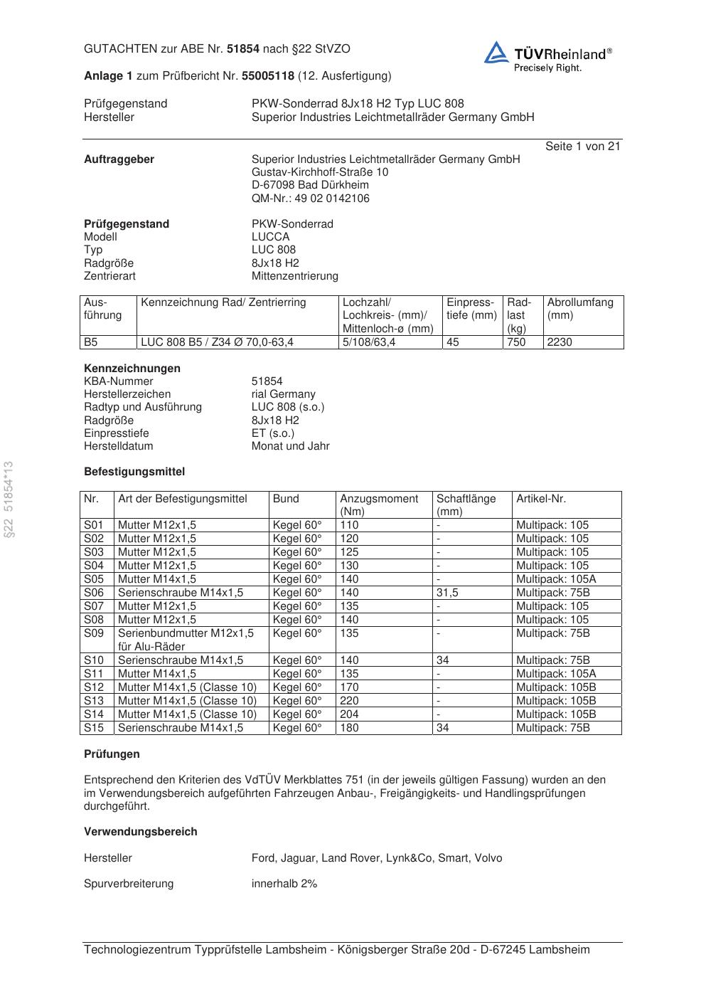Dieses Gutachten (abe) bezieht sich auf die Alufelge brand-rial LUC 808 in der Ausführung 8Jx18 ET 0, Mittenloch 0 mm (KBA 51854). Im PDF findest du typischerweise zulässige Reifengrößen, Auflagen/Anbauhinweise und – je nach Dokument – Hinweise zur Eintragung.