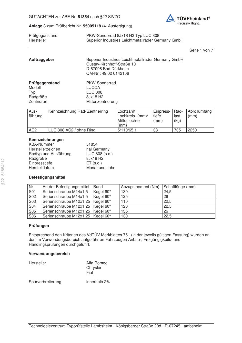 Dieses Gutachten (abe) bezieht sich auf die Alufelge brand-rial LUC 808 in der Ausführung 8Jx18 ET 0, Mittenloch 0 mm (KBA 51854). Im PDF findest du typischerweise zulässige Reifengrößen, Auflagen/Anbauhinweise und – je nach Dokument – Hinweise zur Eintragung.