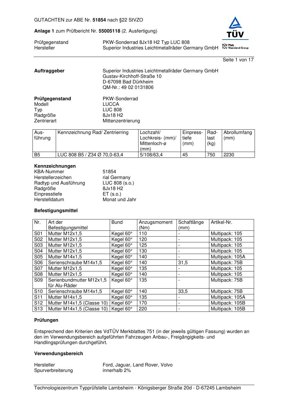 Dieses Gutachten (abe) bezieht sich auf die Alufelge brand-rial LUC 808 in der Ausführung 8Jx18 ET 0, Mittenloch 0 mm (KBA 51854). Im PDF findest du typischerweise zulässige Reifengrößen, Auflagen/Anbauhinweise und – je nach Dokument – Hinweise zur Eintragung.