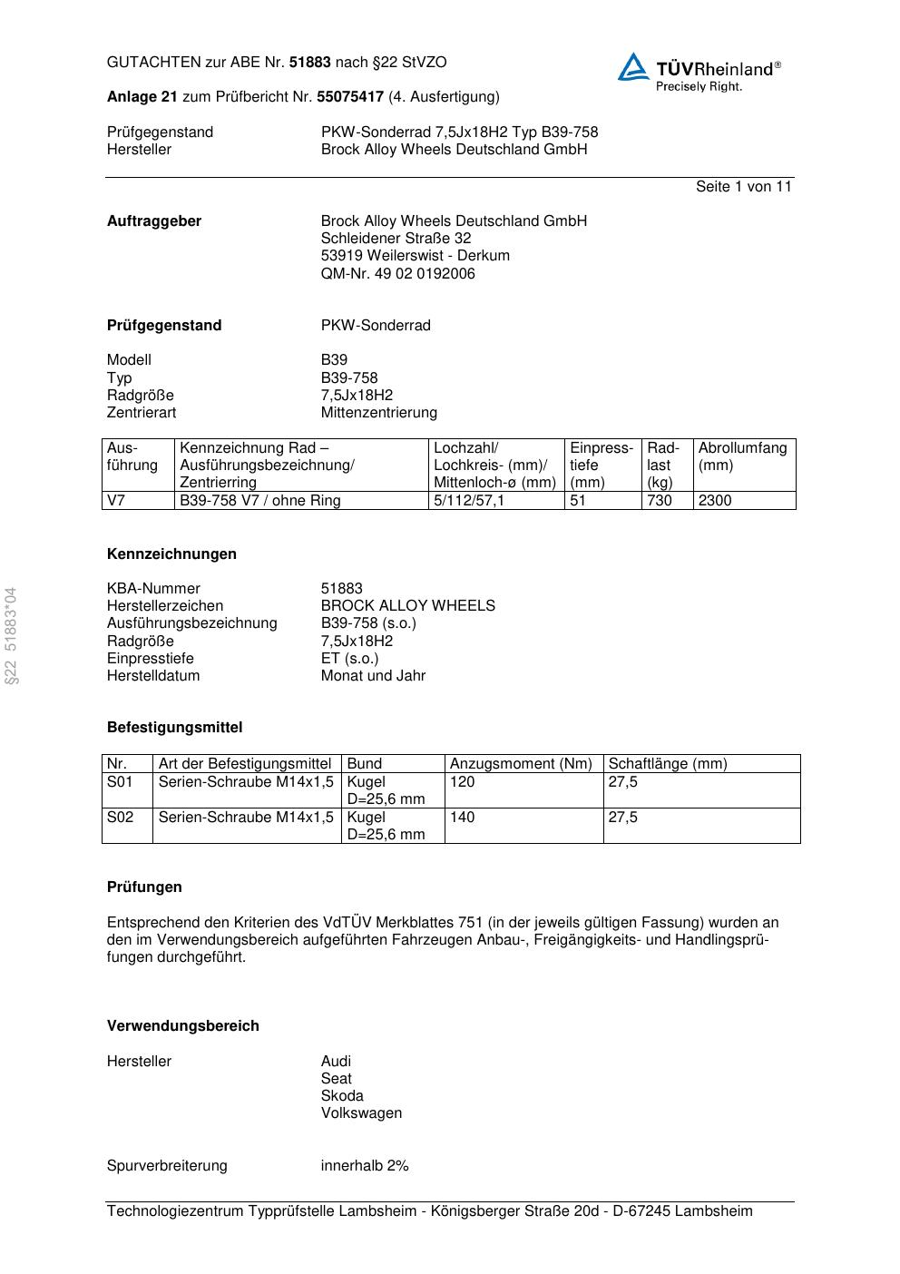 Dieses Gutachten (abe) bezieht sich auf die Alufelge Brock B39-758 in der Ausführung 7.5Jx18 ET 0, Mittenloch 0 mm (KBA 51883). Im PDF findest du typischerweise zulässige Reifengrößen, Auflagen/Anbauhinweise und – je nach Dokument – Hinweise zur Eintragung.