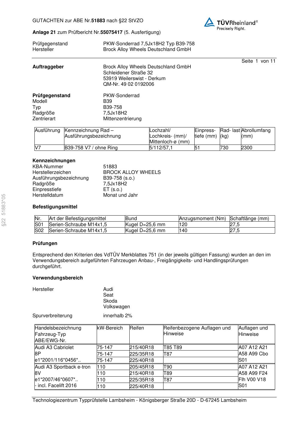 Dieses Gutachten (abe) bezieht sich auf die Alufelge Brock B39-758 in der Ausführung 7.5Jx18 ET 0, Mittenloch 0 mm (KBA 51883). Im PDF findest du typischerweise zulässige Reifengrößen, Auflagen/Anbauhinweise und – je nach Dokument – Hinweise zur Eintragung.