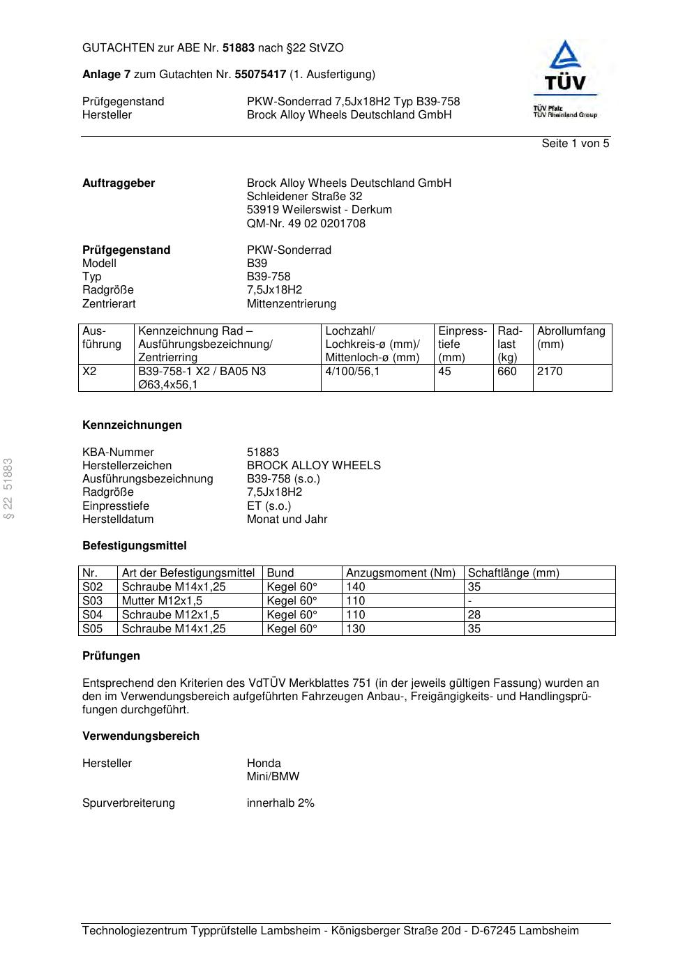 Dieses Gutachten (abe) bezieht sich auf die Alufelge Brock B39-758 in der Ausführung 7.5Jx18 ET 0, Mittenloch 0 mm (KBA 51883). Im PDF findest du typischerweise zulässige Reifengrößen, Auflagen/Anbauhinweise und – je nach Dokument – Hinweise zur Eintragung.