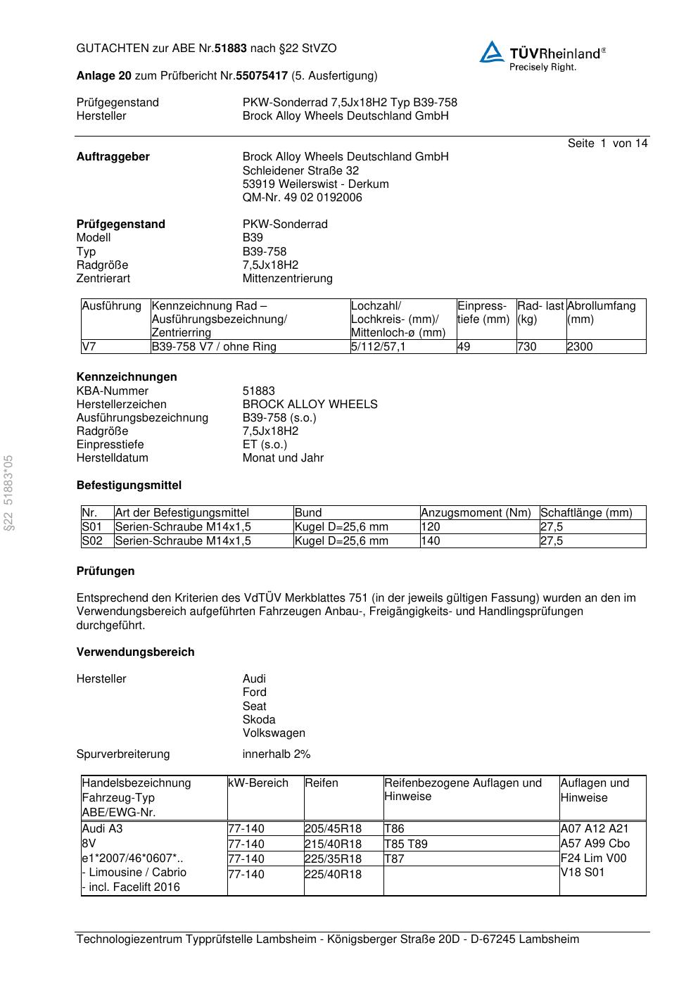 Dieses Gutachten (abe) bezieht sich auf die Alufelge Brock B39-758 in der Ausführung 7.5Jx18 ET 0, Mittenloch 0 mm (KBA 51883). Im PDF findest du typischerweise zulässige Reifengrößen, Auflagen/Anbauhinweise und – je nach Dokument – Hinweise zur Eintragung.