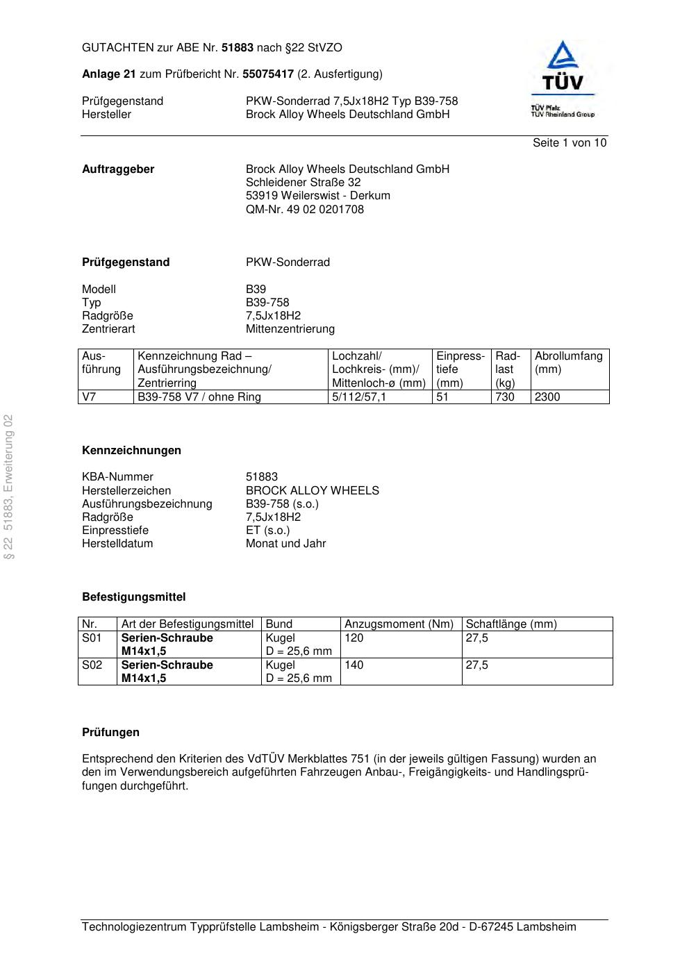 Dieses Gutachten (abe) bezieht sich auf die Alufelge Brock B39-758 in der Ausführung 7.5Jx18 ET 0, Mittenloch 0 mm (KBA 51883). Im PDF findest du typischerweise zulässige Reifengrößen, Auflagen/Anbauhinweise und – je nach Dokument – Hinweise zur Eintragung.