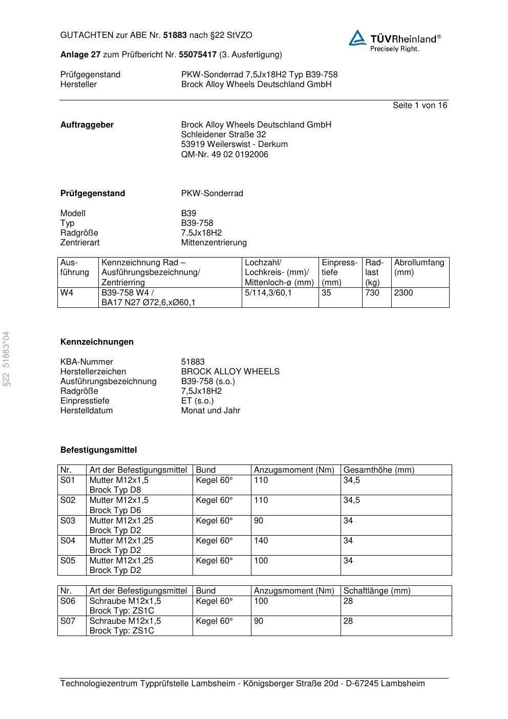 Dieses Gutachten (abe) bezieht sich auf die Alufelge Brock B39-758 in der Ausführung 7.5Jx18 ET 0, Mittenloch 0 mm (KBA 51883). Im PDF findest du typischerweise zulässige Reifengrößen, Auflagen/Anbauhinweise und – je nach Dokument – Hinweise zur Eintragung.
