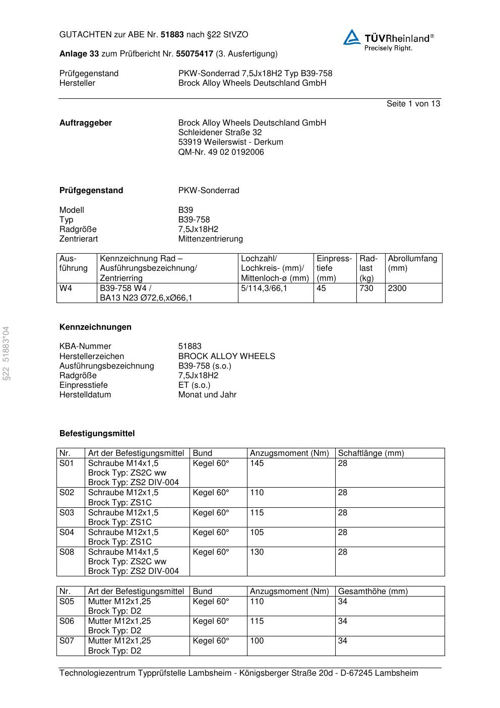 Dieses Gutachten (abe) bezieht sich auf die Alufelge Brock B39-758 in der Ausführung 7.5Jx18 ET 0, Mittenloch 0 mm (KBA 51883). Im PDF findest du typischerweise zulässige Reifengrößen, Auflagen/Anbauhinweise und – je nach Dokument – Hinweise zur Eintragung.
