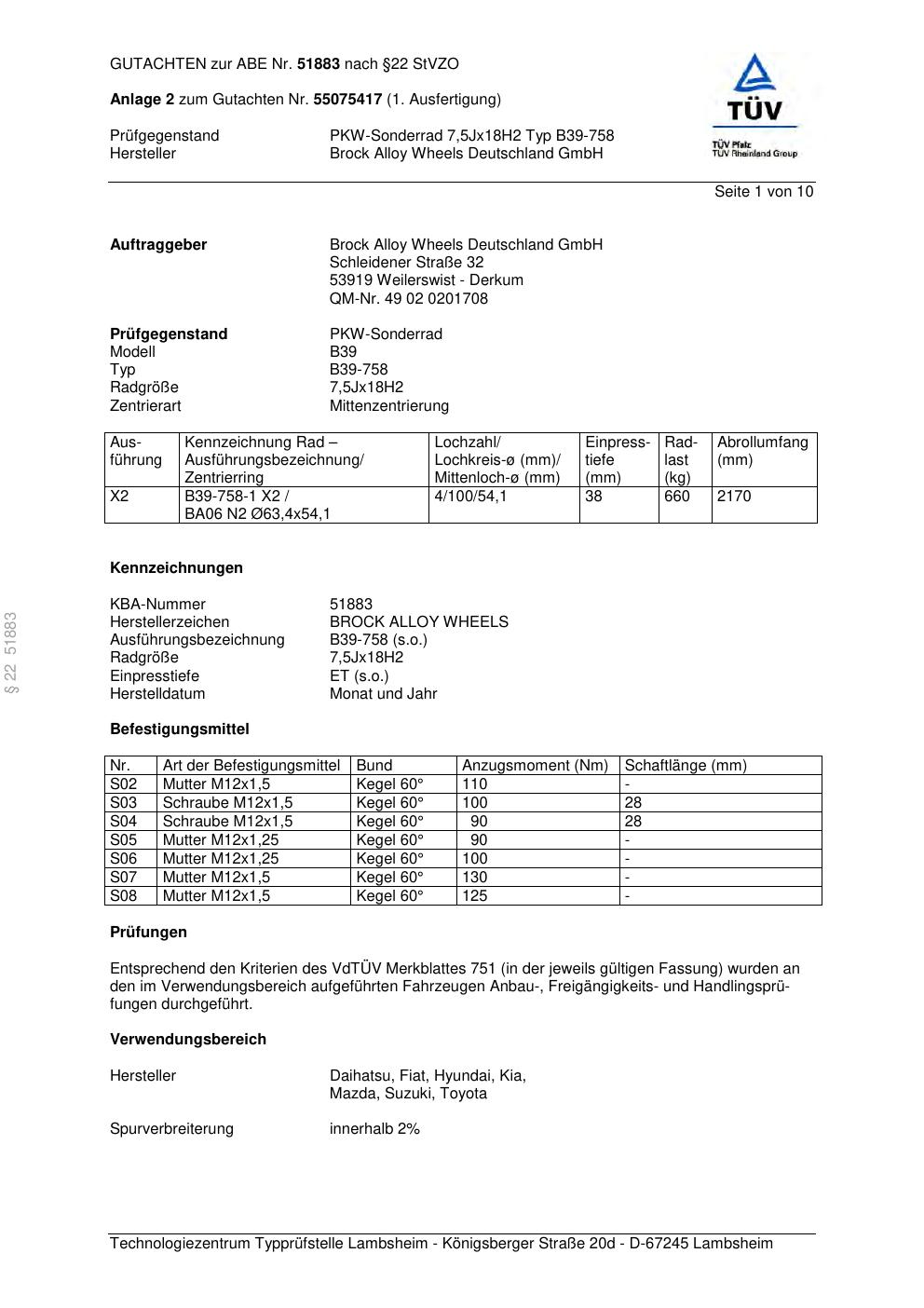 Dieses Gutachten (abe) bezieht sich auf die Alufelge Brock B39-758 in der Ausführung 7.5Jx18 ET 0, Mittenloch 0 mm (KBA 51883). Im PDF findest du typischerweise zulässige Reifengrößen, Auflagen/Anbauhinweise und – je nach Dokument – Hinweise zur Eintragung.