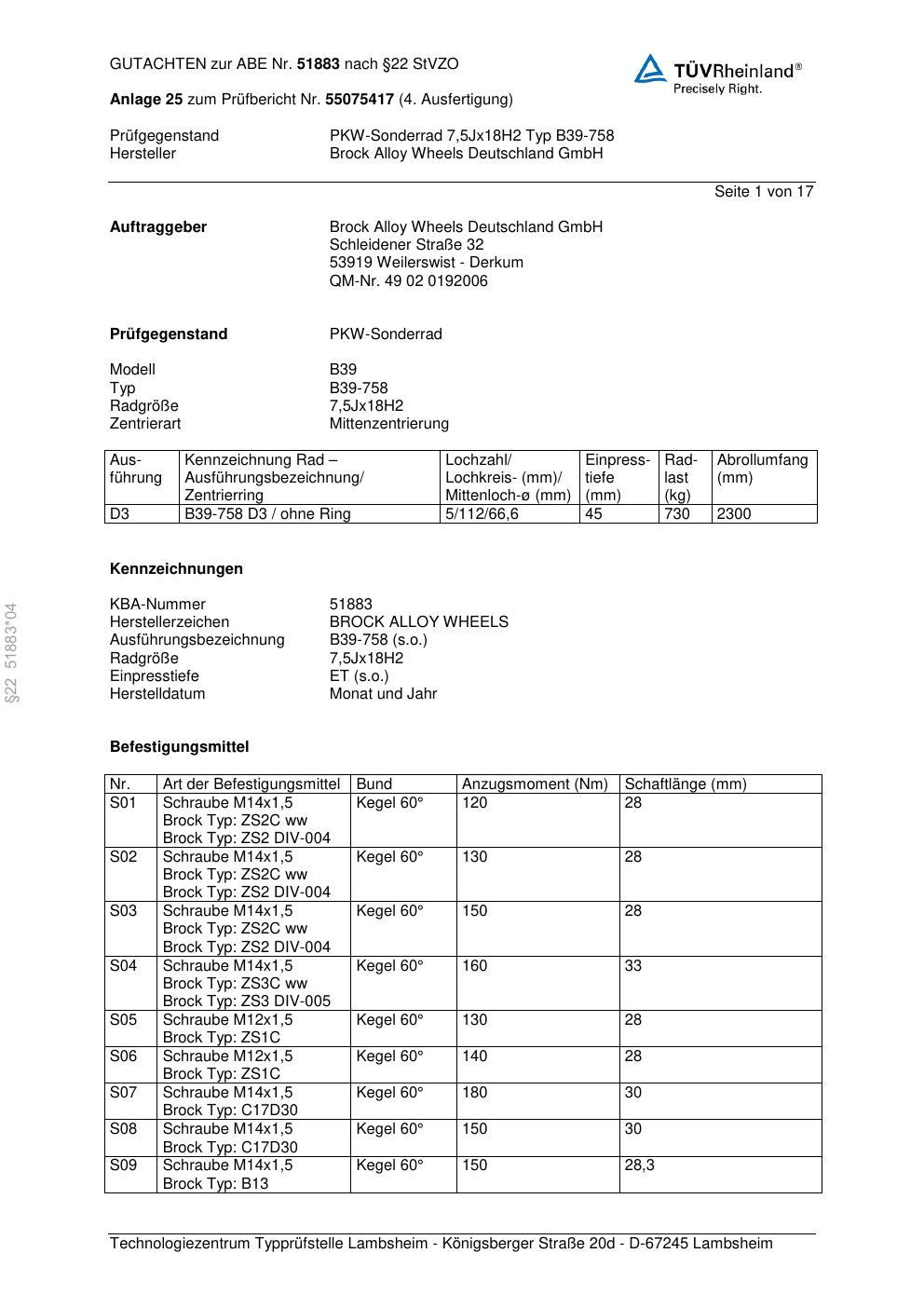 Dieses Gutachten (abe) bezieht sich auf die Alufelge Brock B39-758 in der Ausführung 7.5Jx18 ET 0, Mittenloch 0 mm (KBA 51883). Im PDF findest du typischerweise zulässige Reifengrößen, Auflagen/Anbauhinweise und – je nach Dokument – Hinweise zur Eintragung.