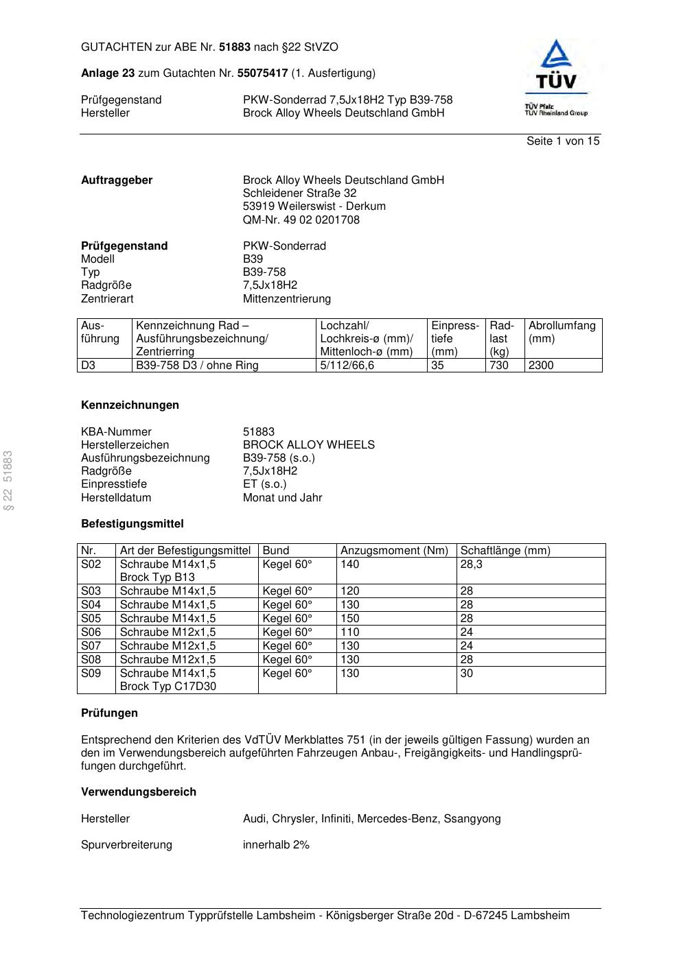 Dieses Gutachten (abe) bezieht sich auf die Alufelge Brock B39-758 in der Ausführung 7.5Jx18 ET 0, Mittenloch 0 mm (KBA 51883). Im PDF findest du typischerweise zulässige Reifengrößen, Auflagen/Anbauhinweise und – je nach Dokument – Hinweise zur Eintragung.