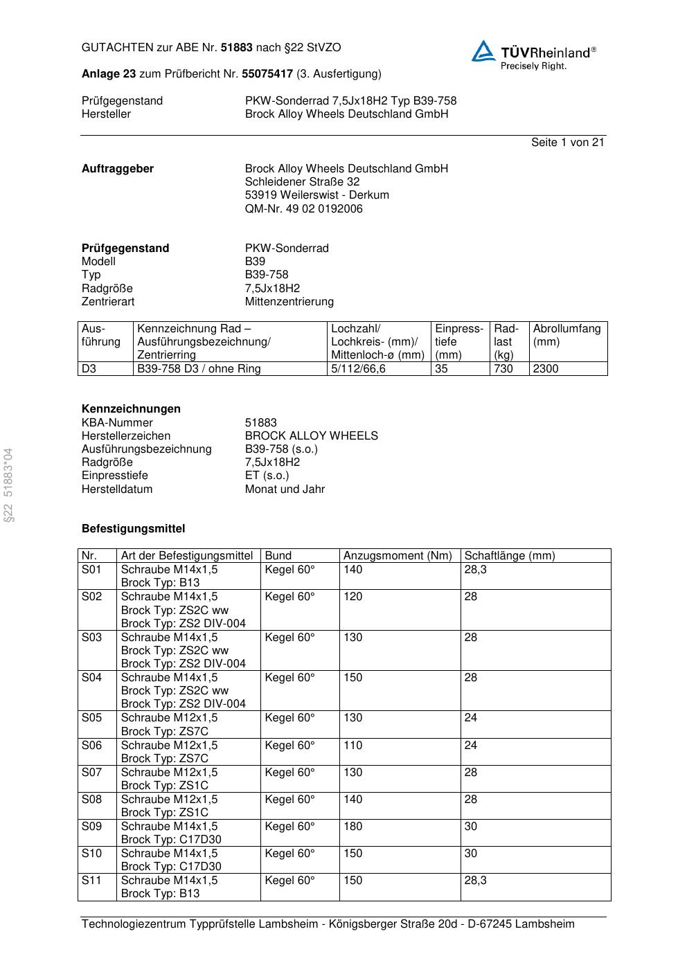 Dieses Gutachten (abe) bezieht sich auf die Alufelge Brock B39-758 in der Ausführung 7.5Jx18 ET 0, Mittenloch 0 mm (KBA 51883). Im PDF findest du typischerweise zulässige Reifengrößen, Auflagen/Anbauhinweise und – je nach Dokument – Hinweise zur Eintragung.