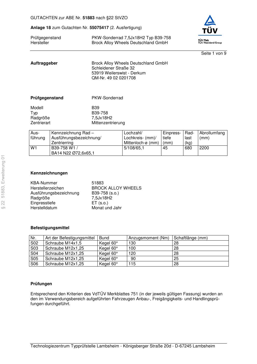 Dieses Gutachten (abe) bezieht sich auf die Alufelge Brock B39-758 in der Ausführung 7.5Jx18 ET 0, Mittenloch 0 mm (KBA 51883). Im PDF findest du typischerweise zulässige Reifengrößen, Auflagen/Anbauhinweise und – je nach Dokument – Hinweise zur Eintragung.