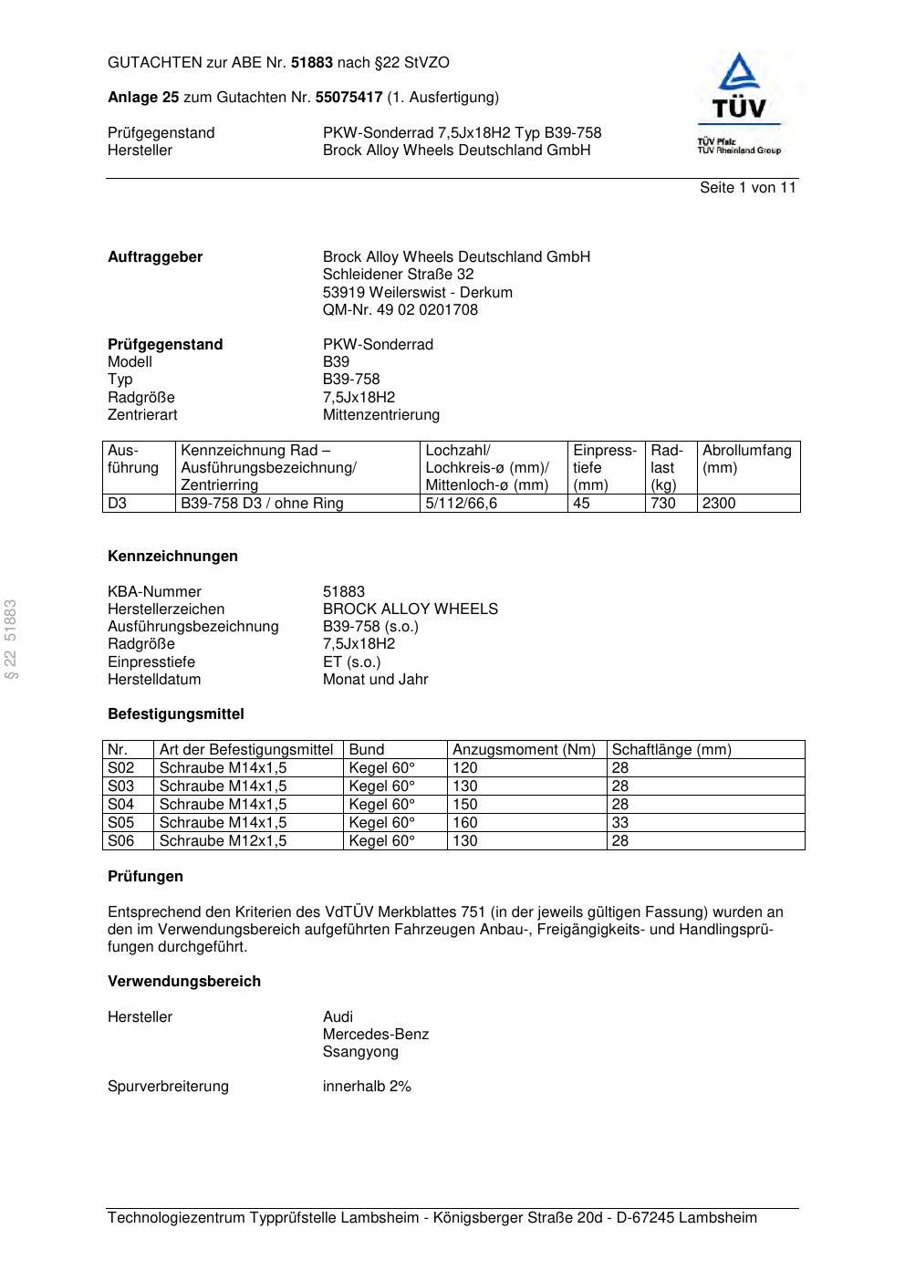 Dieses Gutachten (abe) bezieht sich auf die Alufelge Brock B39-758 in der Ausführung 7.5Jx18 ET 0, Mittenloch 0 mm (KBA 51883). Im PDF findest du typischerweise zulässige Reifengrößen, Auflagen/Anbauhinweise und – je nach Dokument – Hinweise zur Eintragung.