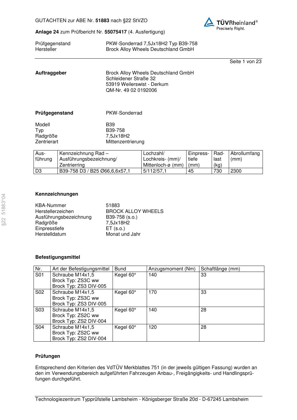 Dieses Gutachten (abe) bezieht sich auf die Alufelge Brock B39-758 in der Ausführung 7.5Jx18 ET 0, Mittenloch 0 mm (KBA 51883). Im PDF findest du typischerweise zulässige Reifengrößen, Auflagen/Anbauhinweise und – je nach Dokument – Hinweise zur Eintragung.