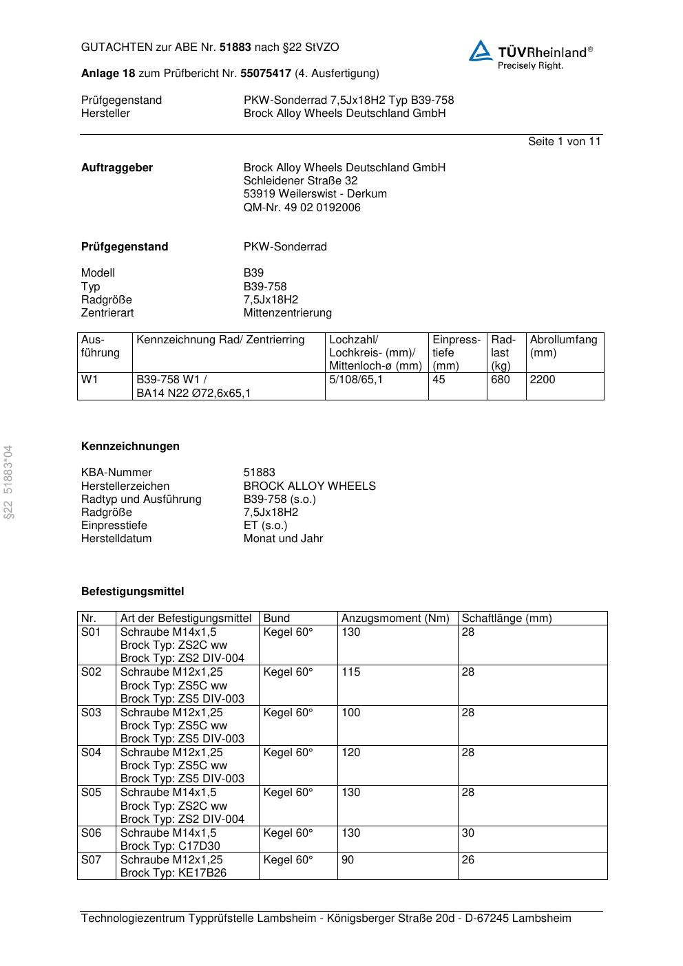 Dieses Gutachten (abe) bezieht sich auf die Alufelge Brock B39-758 in der Ausführung 7.5Jx18 ET 0, Mittenloch 0 mm (KBA 51883). Im PDF findest du typischerweise zulässige Reifengrößen, Auflagen/Anbauhinweise und – je nach Dokument – Hinweise zur Eintragung.