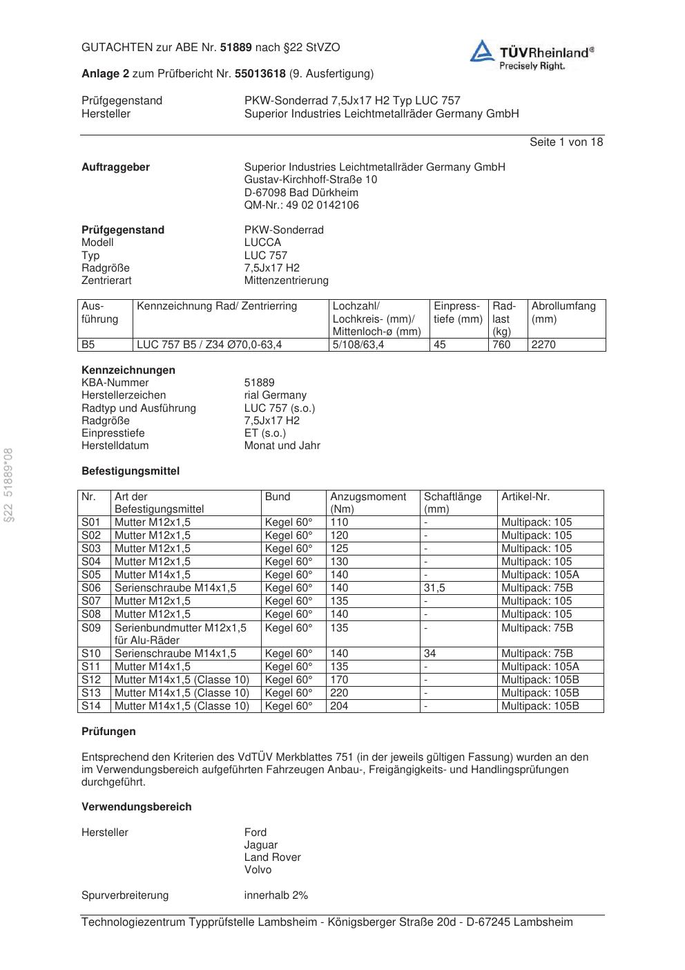 Dieses Gutachten (abe) bezieht sich auf die Alufelge brand-rial LUC 757 in der Ausführung 7.5Jx17 ET 0, Mittenloch 0 mm (KBA 51889). Im PDF findest du typischerweise zulässige Reifengrößen, Auflagen/Anbauhinweise und – je nach Dokument – Hinweise zur Eintragung.