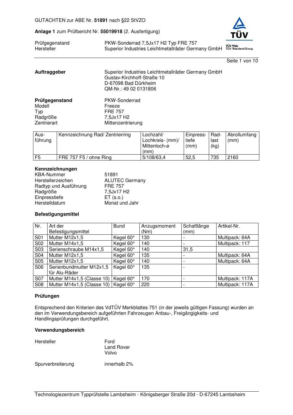 Dieses Gutachten (abe) bezieht sich auf die Alufelge ALUTEC FRE 757 in der Ausführung 7.5Jx17 ET 0, Mittenloch 0 mm (KBA 51891). Im PDF findest du typischerweise zulässige Reifengrößen, Auflagen/Anbauhinweise und – je nach Dokument – Hinweise zur Eintragung.