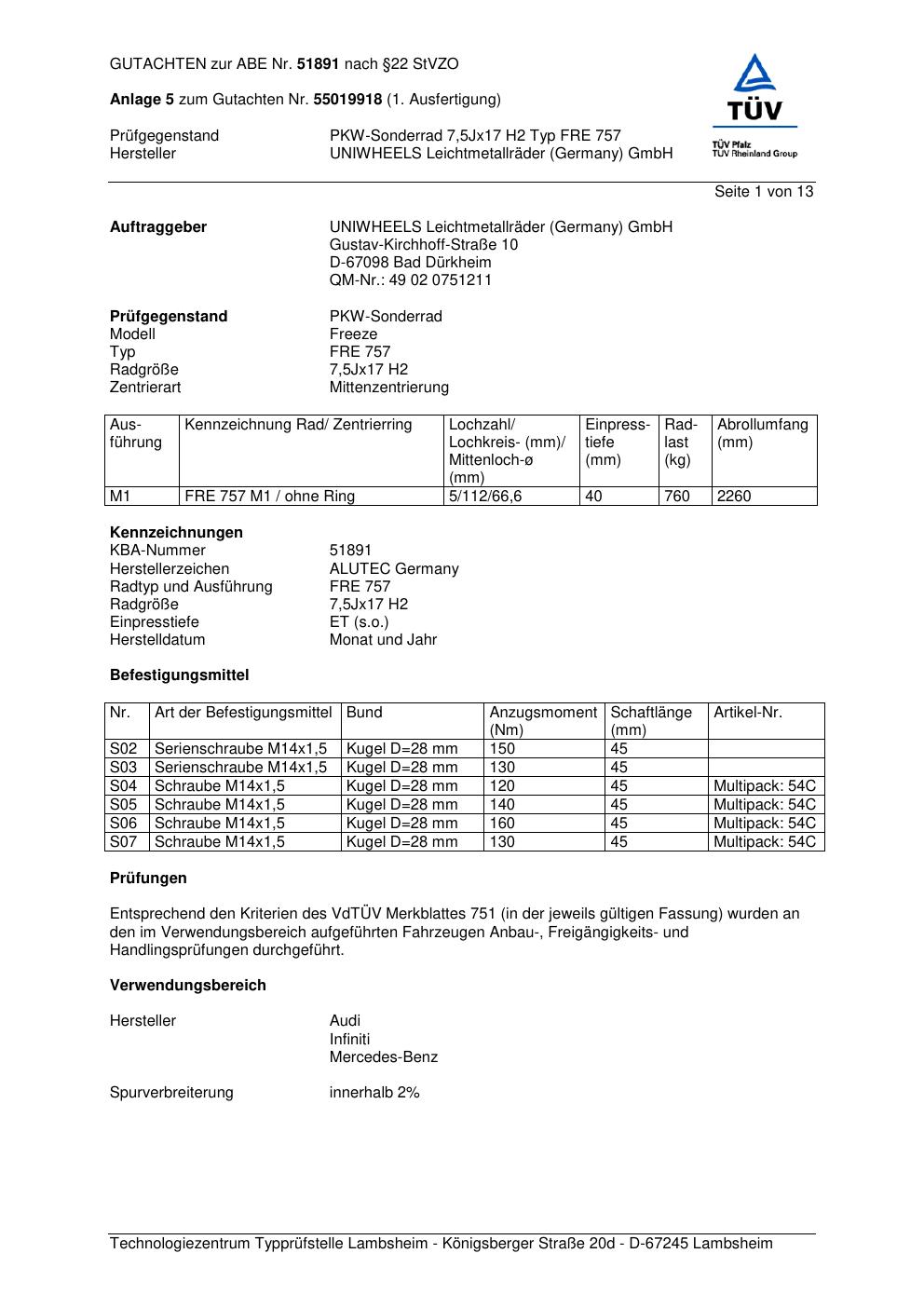 Dieses Gutachten (abe) bezieht sich auf die Alufelge ALUTEC FRE 757 in der Ausführung 7.5Jx17 ET 0, Mittenloch 0 mm (KBA 51891). Im PDF findest du typischerweise zulässige Reifengrößen, Auflagen/Anbauhinweise und – je nach Dokument – Hinweise zur Eintragung.
