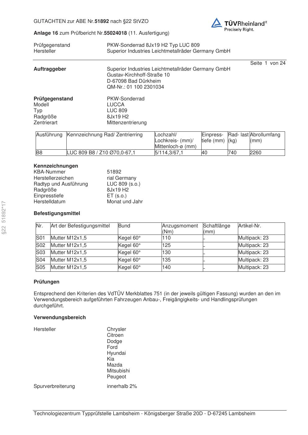 Dieses Gutachten (abe) bezieht sich auf die Alufelge brand-rial LUC 809 in der Ausführung 8Jx19 ET 0, Mittenloch 0 mm (KBA 51892). Im PDF findest du typischerweise zulässige Reifengrößen, Auflagen/Anbauhinweise und – je nach Dokument – Hinweise zur Eintragung.