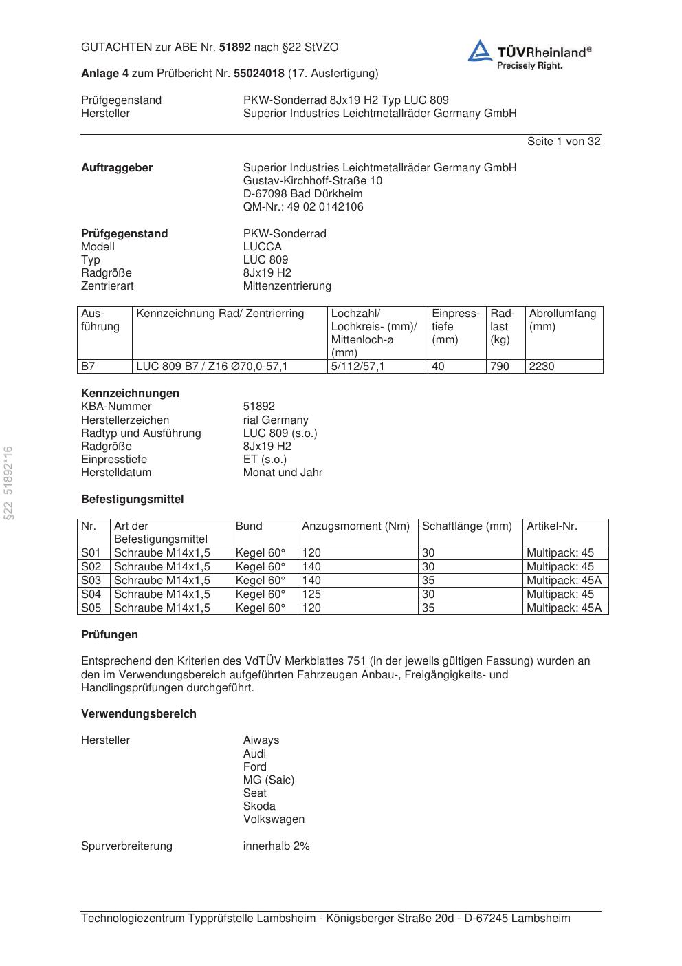 Dieses Gutachten (abe) bezieht sich auf die Alufelge brand-rial LUC 809 in der Ausführung 8Jx19 ET 0, Mittenloch 0 mm (KBA 51892). Im PDF findest du typischerweise zulässige Reifengrößen, Auflagen/Anbauhinweise und – je nach Dokument – Hinweise zur Eintragung.