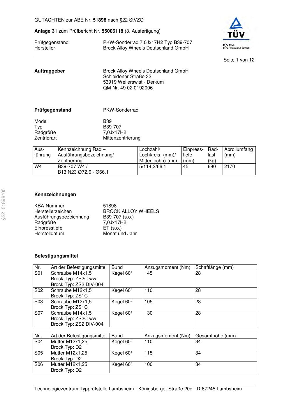 Dieses Gutachten (abe) bezieht sich auf die Alufelge Brock B39-707 in der Ausführung 7Jx17 ET 0, Mittenloch 0 mm (KBA 51898). Im PDF findest du typischerweise zulässige Reifengrößen, Auflagen/Anbauhinweise und – je nach Dokument – Hinweise zur Eintragung.