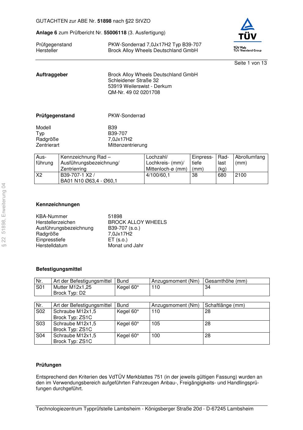 Dieses Gutachten (abe) bezieht sich auf die Alufelge Brock B39-707 in der Ausführung 7Jx17 ET 0, Mittenloch 0 mm (KBA 51898). Im PDF findest du typischerweise zulässige Reifengrößen, Auflagen/Anbauhinweise und – je nach Dokument – Hinweise zur Eintragung.