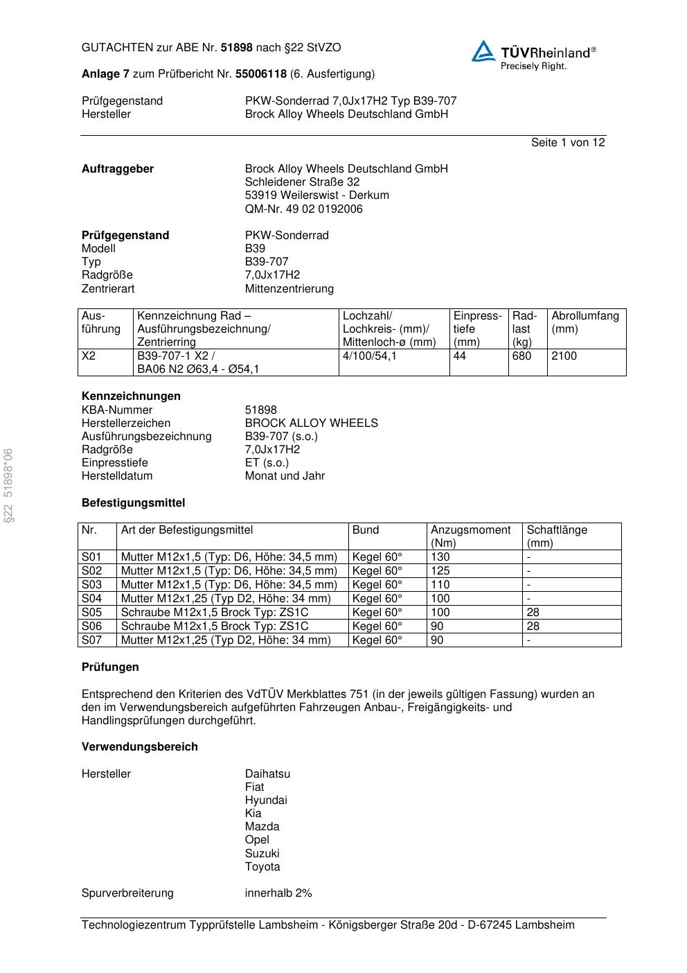 Dieses Gutachten (abe) bezieht sich auf die Alufelge Brock B39-707 in der Ausführung 7Jx17 ET 0, Mittenloch 0 mm (KBA 51898). Im PDF findest du typischerweise zulässige Reifengrößen, Auflagen/Anbauhinweise und – je nach Dokument – Hinweise zur Eintragung.