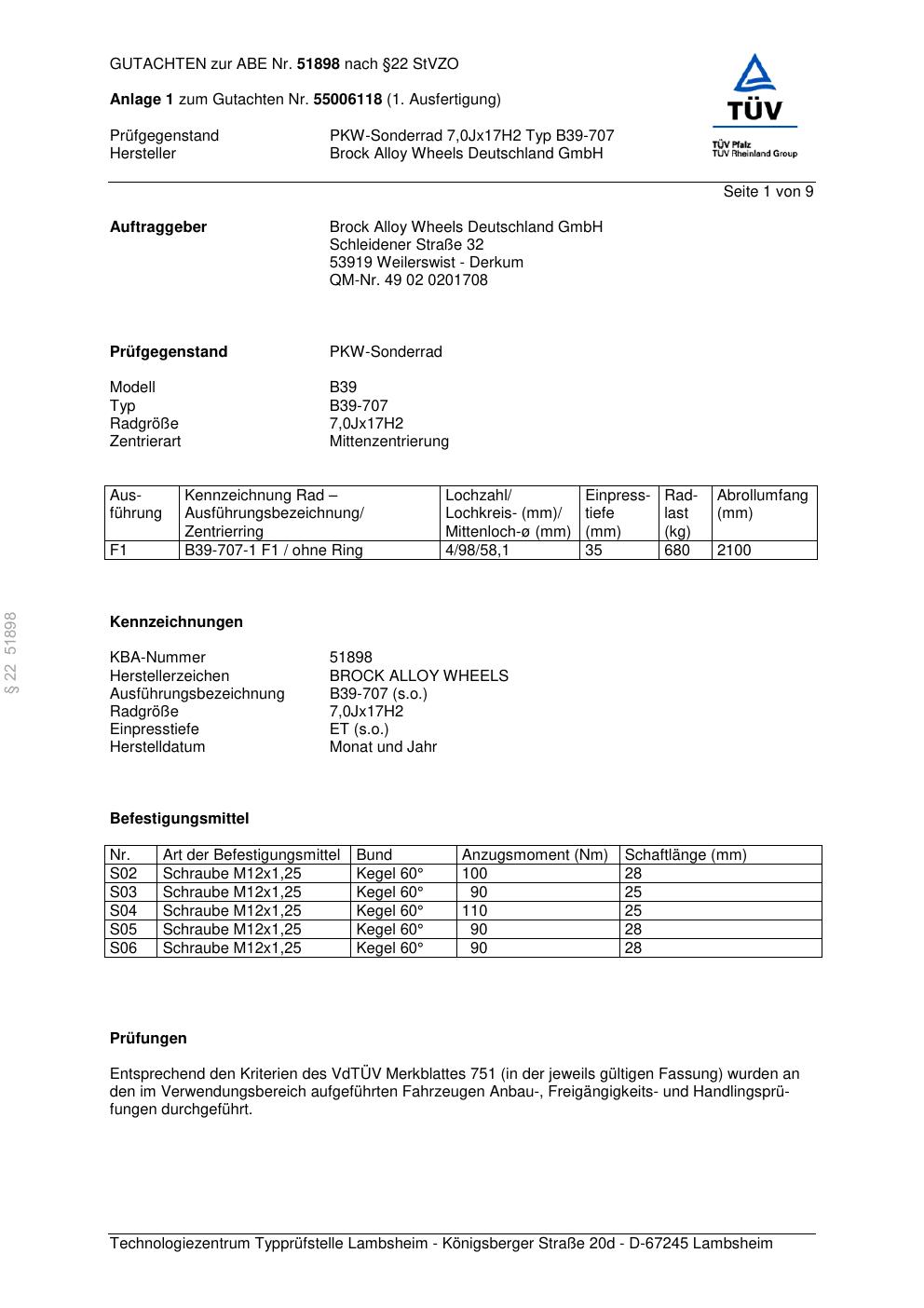 Dieses Gutachten (abe) bezieht sich auf die Alufelge Brock B39-707 in der Ausführung 7Jx17 ET 0, Mittenloch 0 mm (KBA 51898). Im PDF findest du typischerweise zulässige Reifengrößen, Auflagen/Anbauhinweise und – je nach Dokument – Hinweise zur Eintragung.