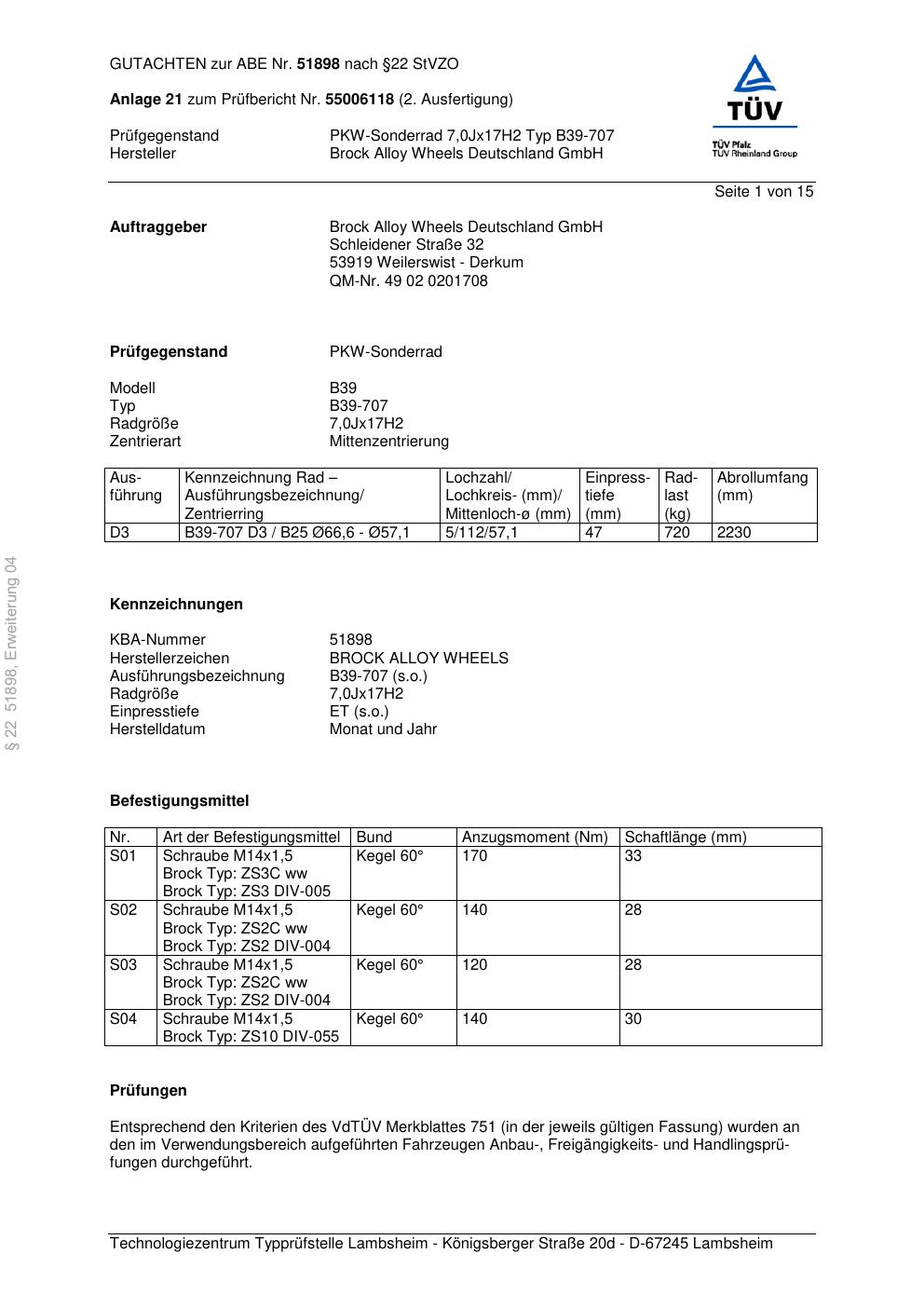 Dieses Gutachten (abe) bezieht sich auf die Alufelge Brock B39-707 in der Ausführung 7Jx17 ET 0, Mittenloch 0 mm (KBA 51898). Im PDF findest du typischerweise zulässige Reifengrößen, Auflagen/Anbauhinweise und – je nach Dokument – Hinweise zur Eintragung.