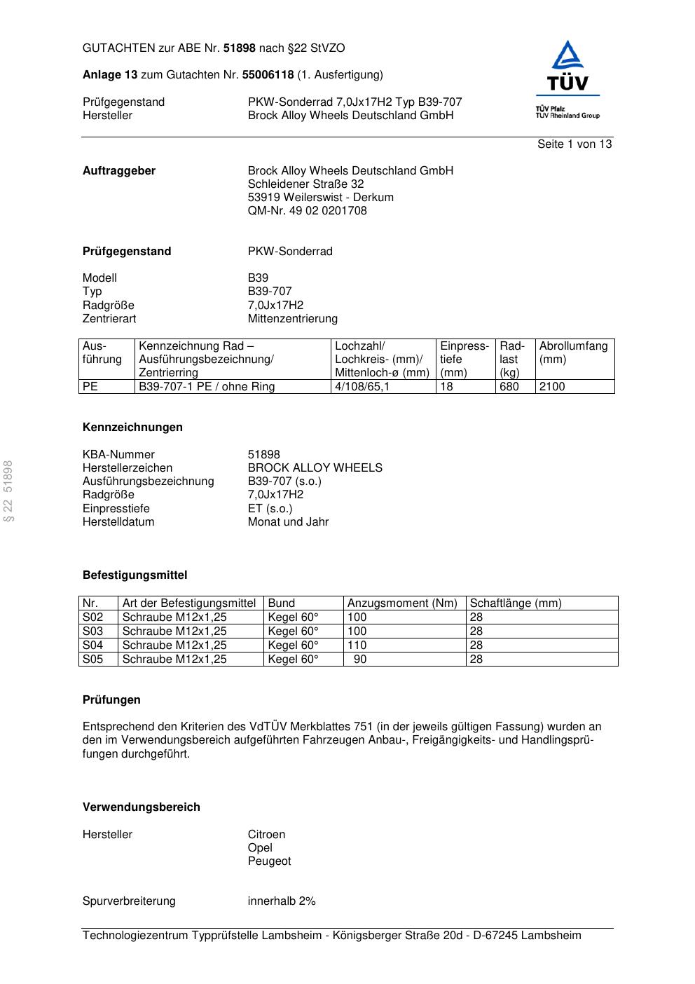 Dieses Gutachten (abe) bezieht sich auf die Alufelge Brock B39-707 in der Ausführung 7Jx17 ET 0, Mittenloch 0 mm (KBA 51898). Im PDF findest du typischerweise zulässige Reifengrößen, Auflagen/Anbauhinweise und – je nach Dokument – Hinweise zur Eintragung.