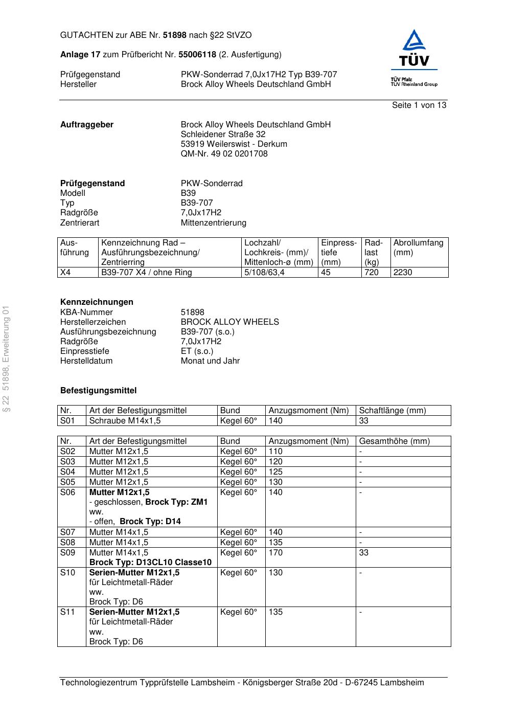 Dieses Gutachten (abe) bezieht sich auf die Alufelge Brock B39-707 in der Ausführung 7Jx17 ET 0, Mittenloch 0 mm (KBA 51898). Im PDF findest du typischerweise zulässige Reifengrößen, Auflagen/Anbauhinweise und – je nach Dokument – Hinweise zur Eintragung.