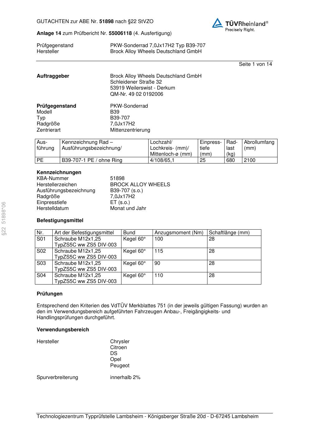 Dieses Gutachten (abe) bezieht sich auf die Alufelge Brock B39-707 in der Ausführung 7Jx17 ET 0, Mittenloch 0 mm (KBA 51898). Im PDF findest du typischerweise zulässige Reifengrößen, Auflagen/Anbauhinweise und – je nach Dokument – Hinweise zur Eintragung.